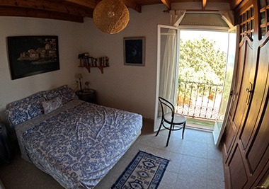 The large bedroom includes a double bed and a balcony looking onto the plaza.